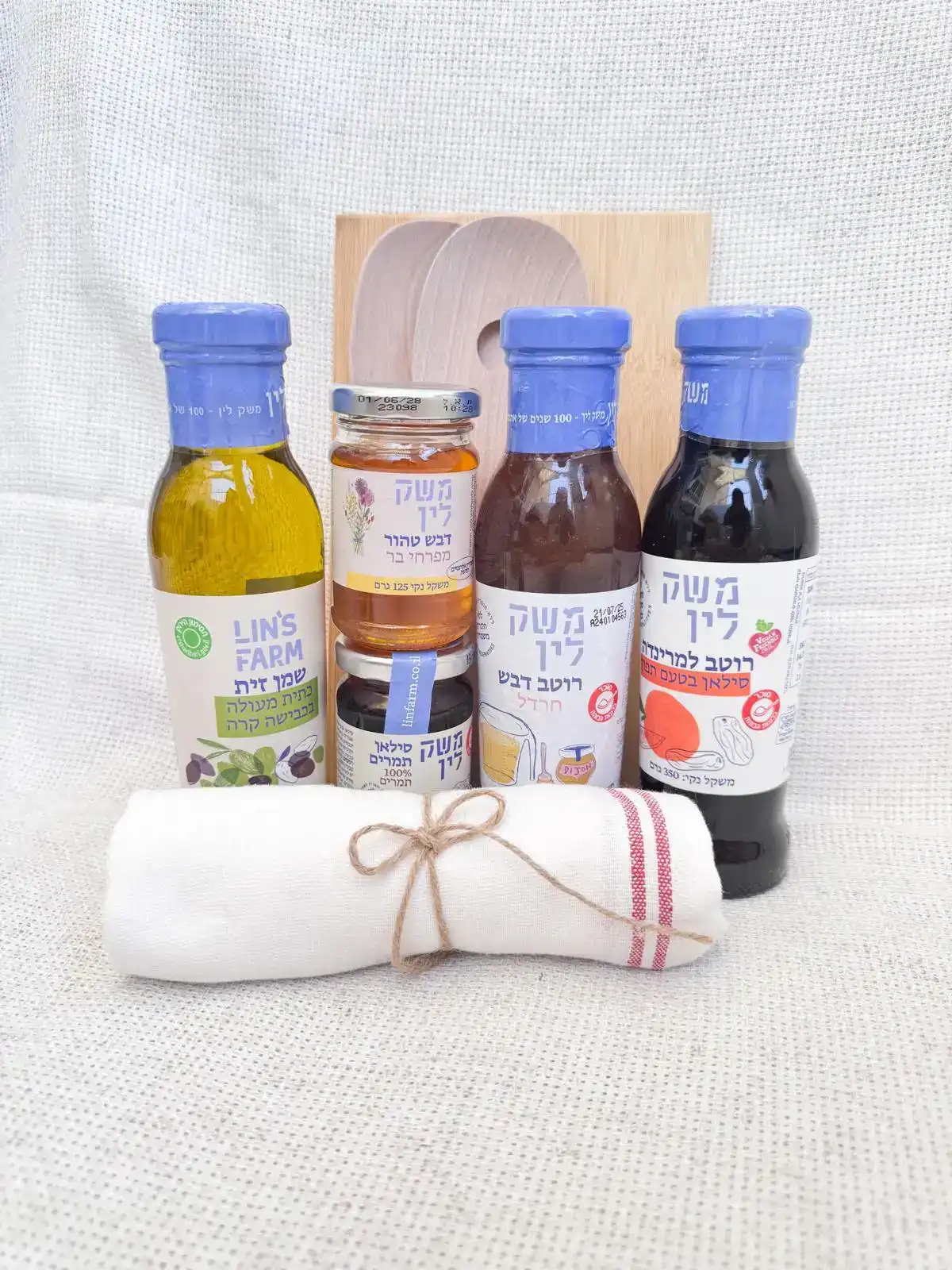 ממרח ארטישוק, 190 גרם ממרח לימונים כבושים , 190 גרם ממרח קונפי שום , 190 גרם שמן זית ישראלי כתית מעולה, 250מ"ל סט כלי הגשה לסלט 2 חלקים, עץ ליבנה מלא קרש חיתוך במבוק מגבת מטבח