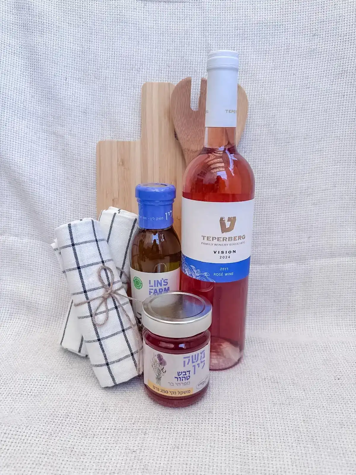 שמן זית ישראלי כתית מעולה, 250 מ"ל דבש טהור פרחי בר, 250 גרם יין לבן טפרברג מסדרת VISION קרש חיתוך במבוק סט כלי הגשה לסלט 2 חלקים, במבוק זוג מגבת מטבח